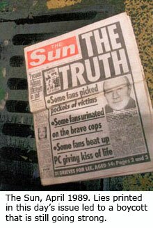 The boycott of The Sun goes back to April 1989, over 20 years ago. On April 15th 1989 a disaster took place which resulted in the deaths of ninety-six Liverpool supporters at Hillsborough, the home ground of Sheffield Wednesday, during an FA Cup semi-final between Liverpool and Nottingham Forest. Ninety-six people had their lives crushed out of them. Many more are said to have ended their own lives since as a consequence of that disaster. A lot of injustices came out of that disaster, far too many to list here. For more information visit the Hillsborough Justice Campaign website at http://www.contrast.org/hillsborough and please try to support them.